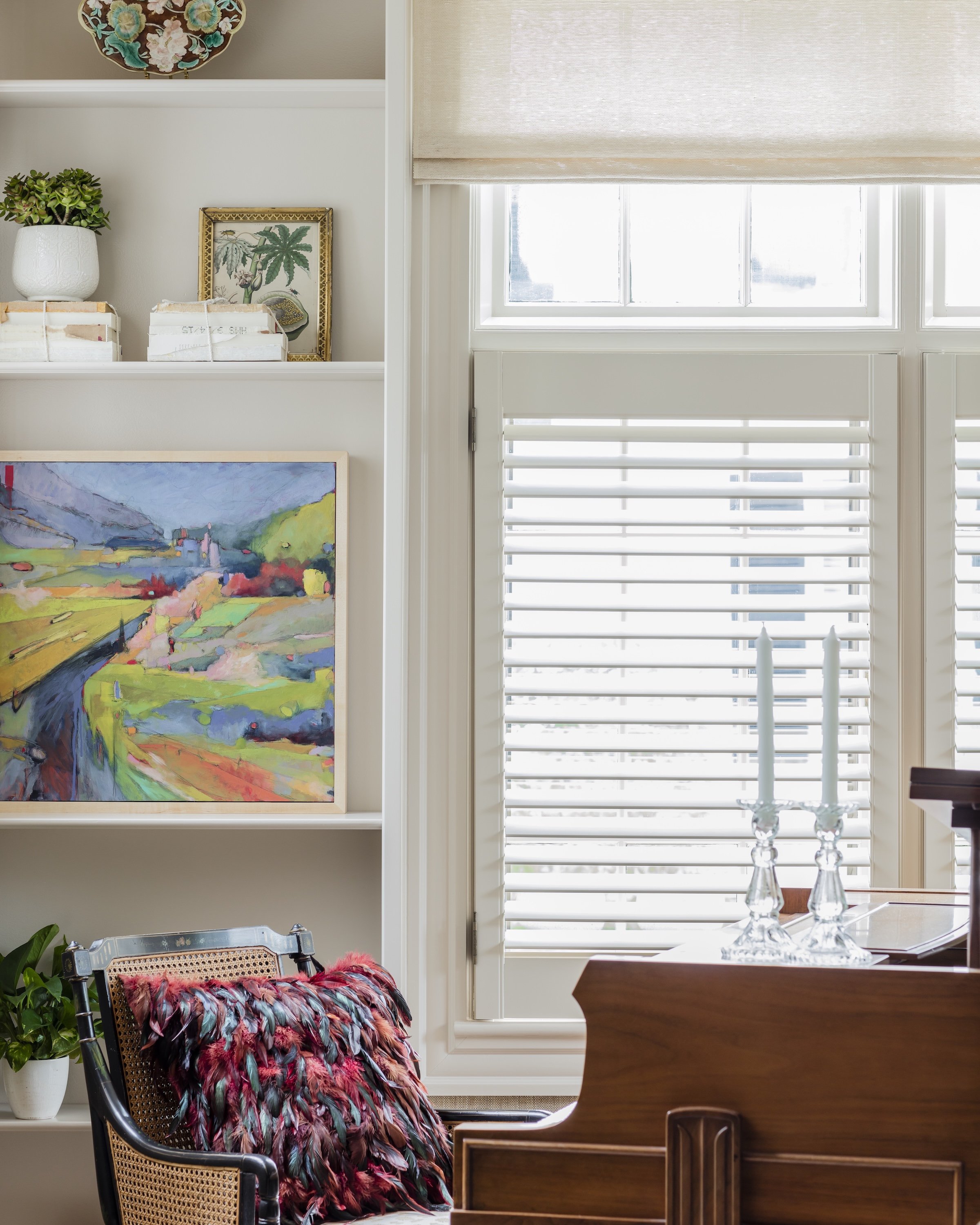 Natural light shapes the space, highlighting polished wood floors and rich textural details. Select jewel tones introduce inviting hues that complement the vintage feel while creating a sense of comfort throughout.