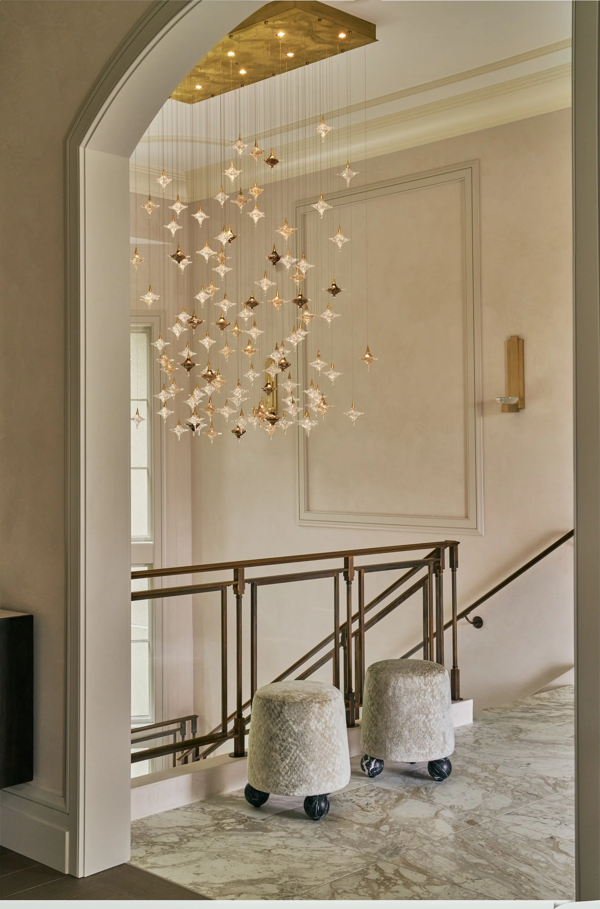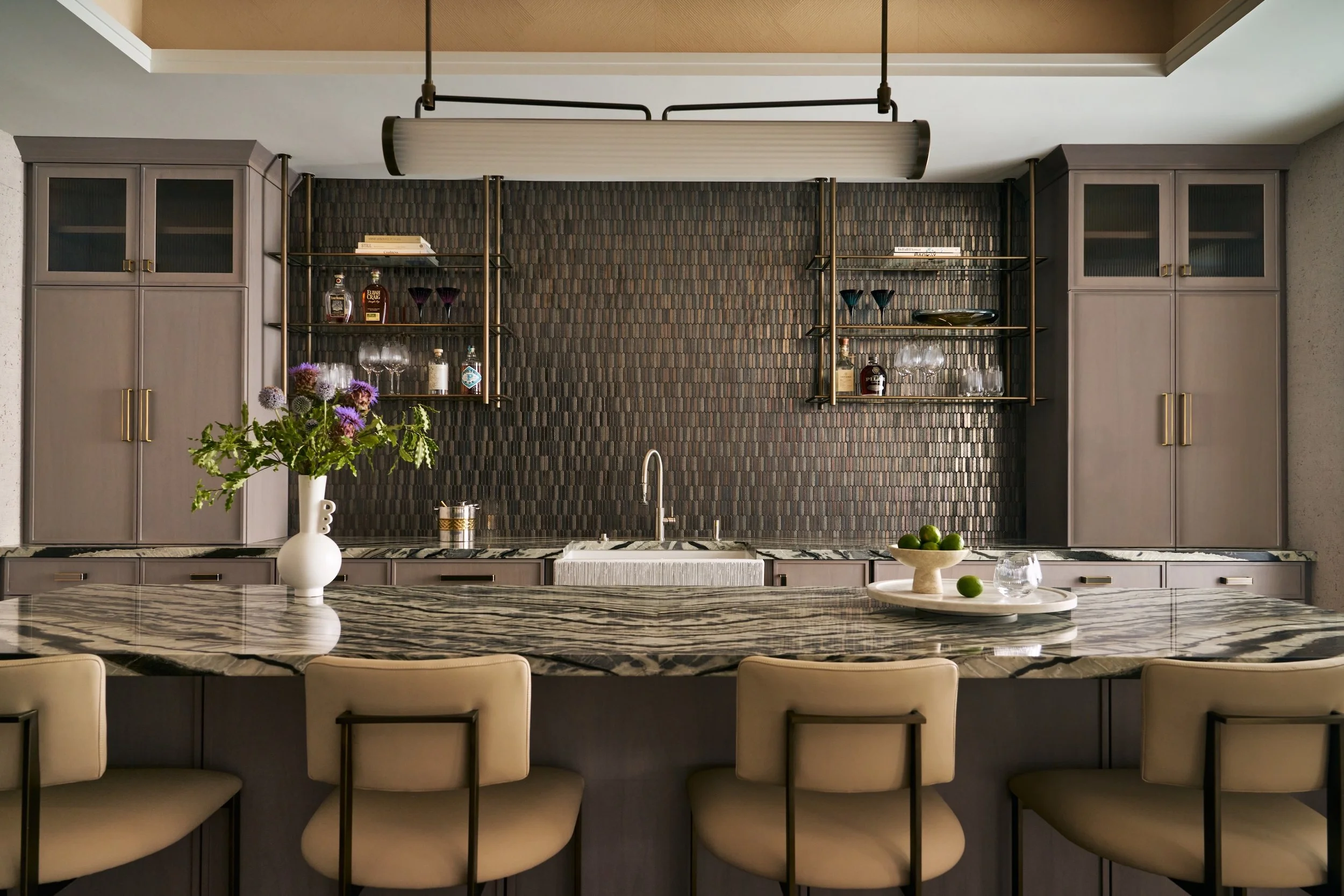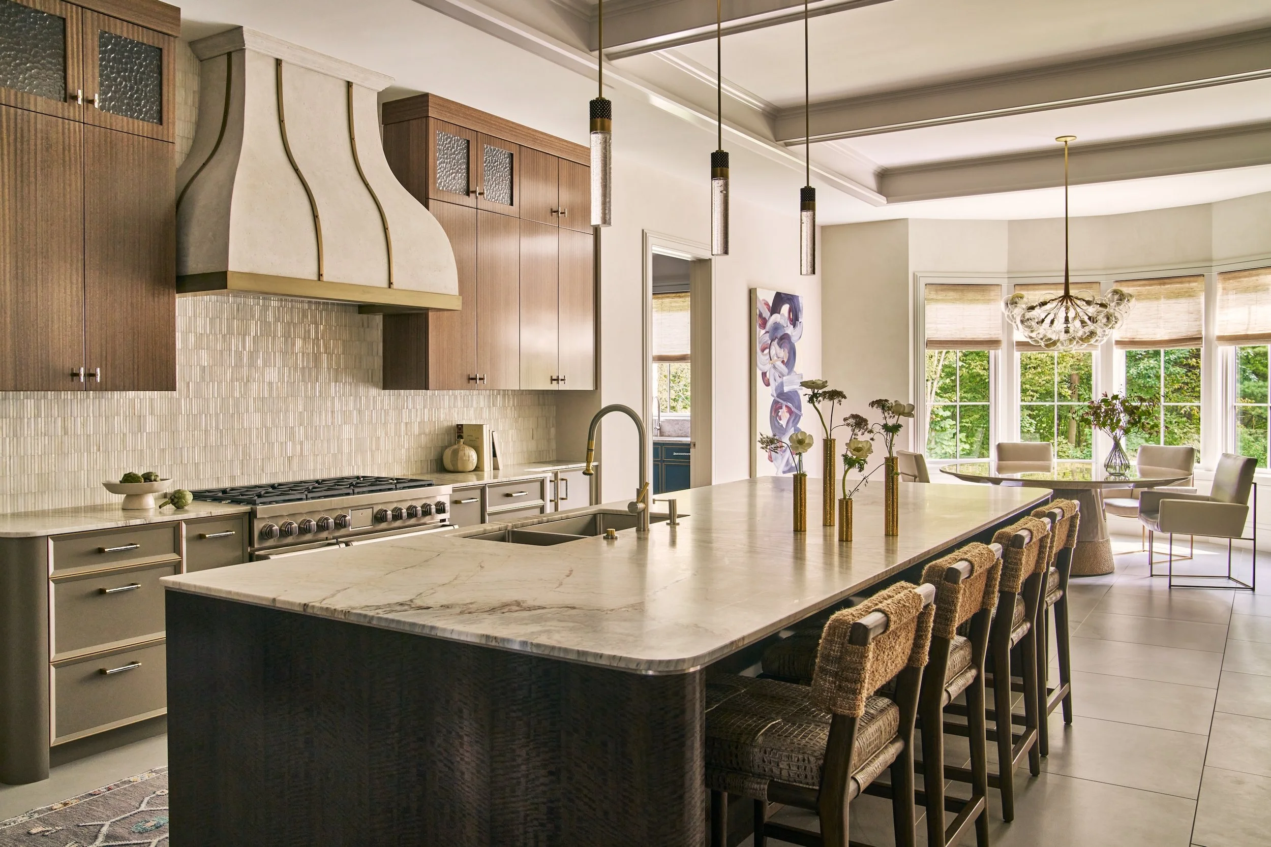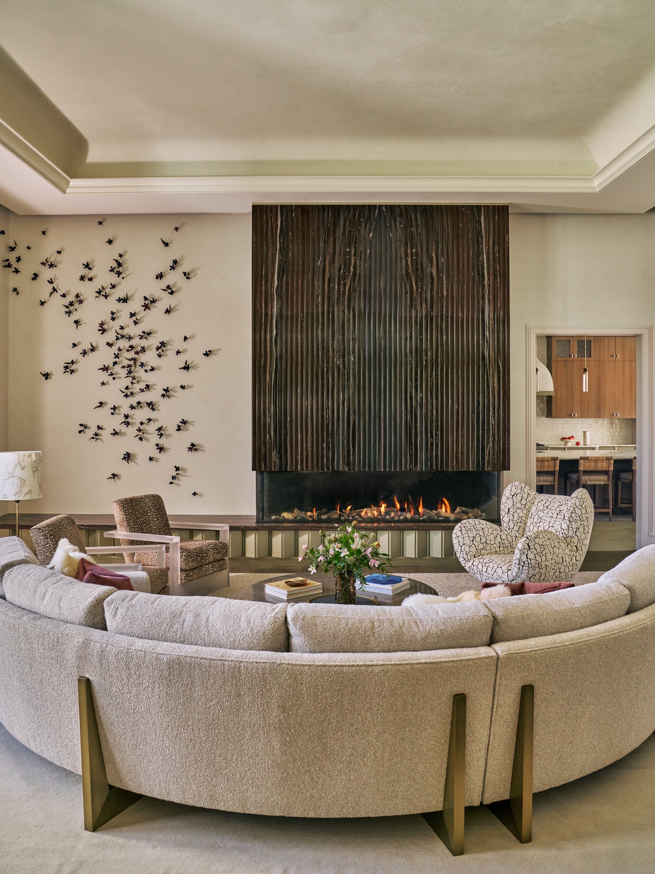 Bronze, marble, and fluted stone mark the architectural language—from the sculptural staircase to the fireplace and custom stone slab work—while layered woods and an entertainer’s lower level balance elegance with warmth and ease.