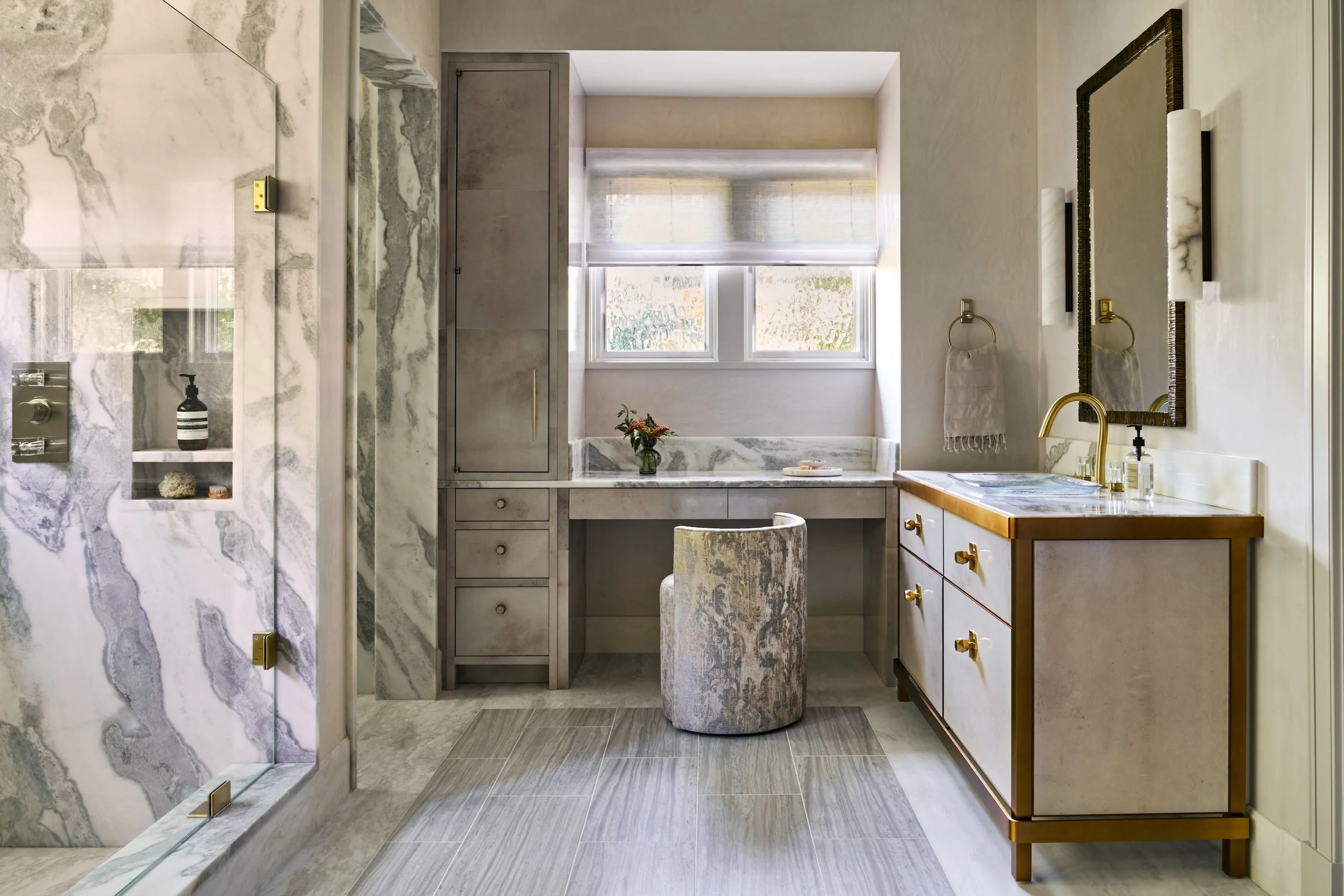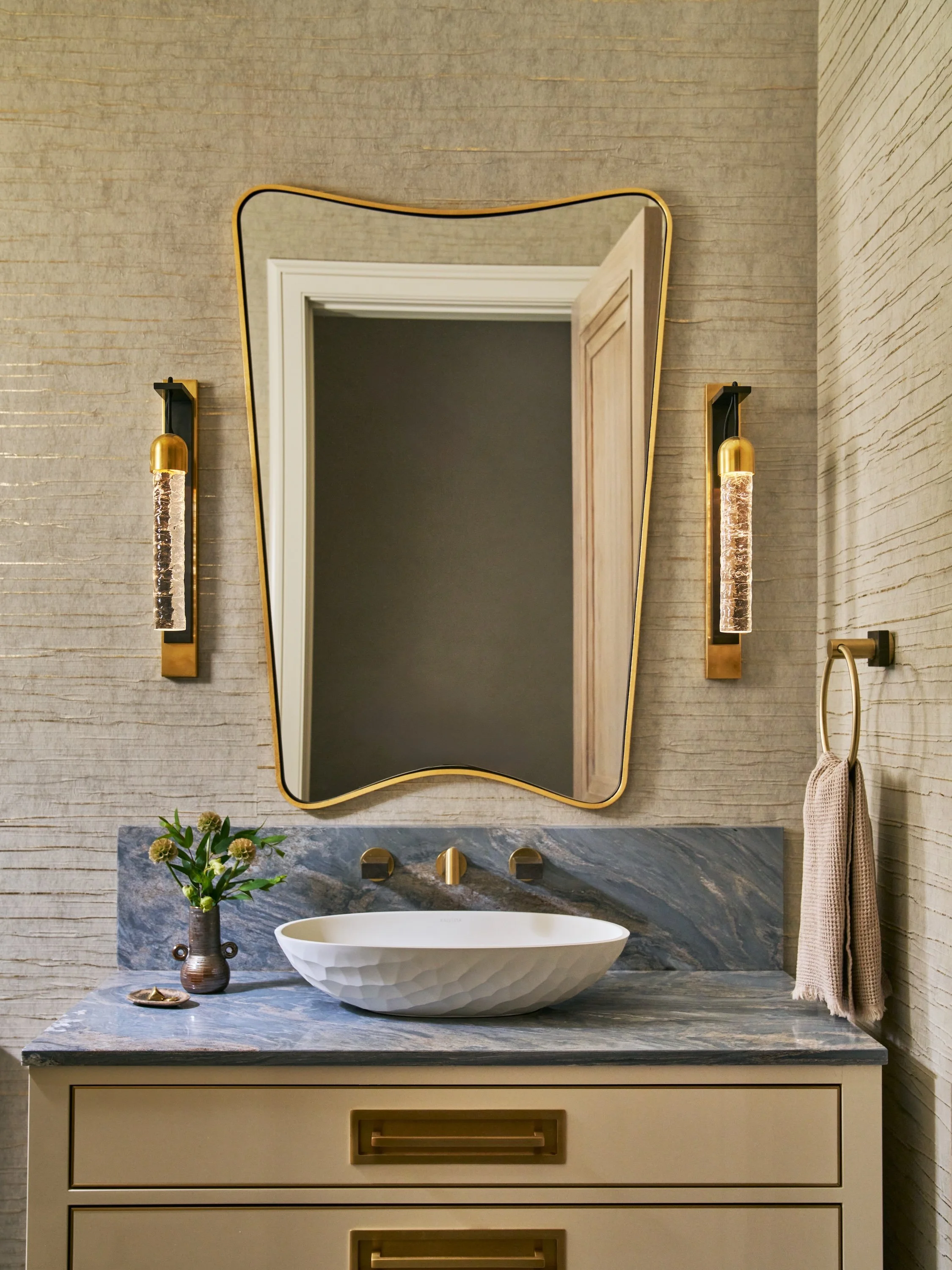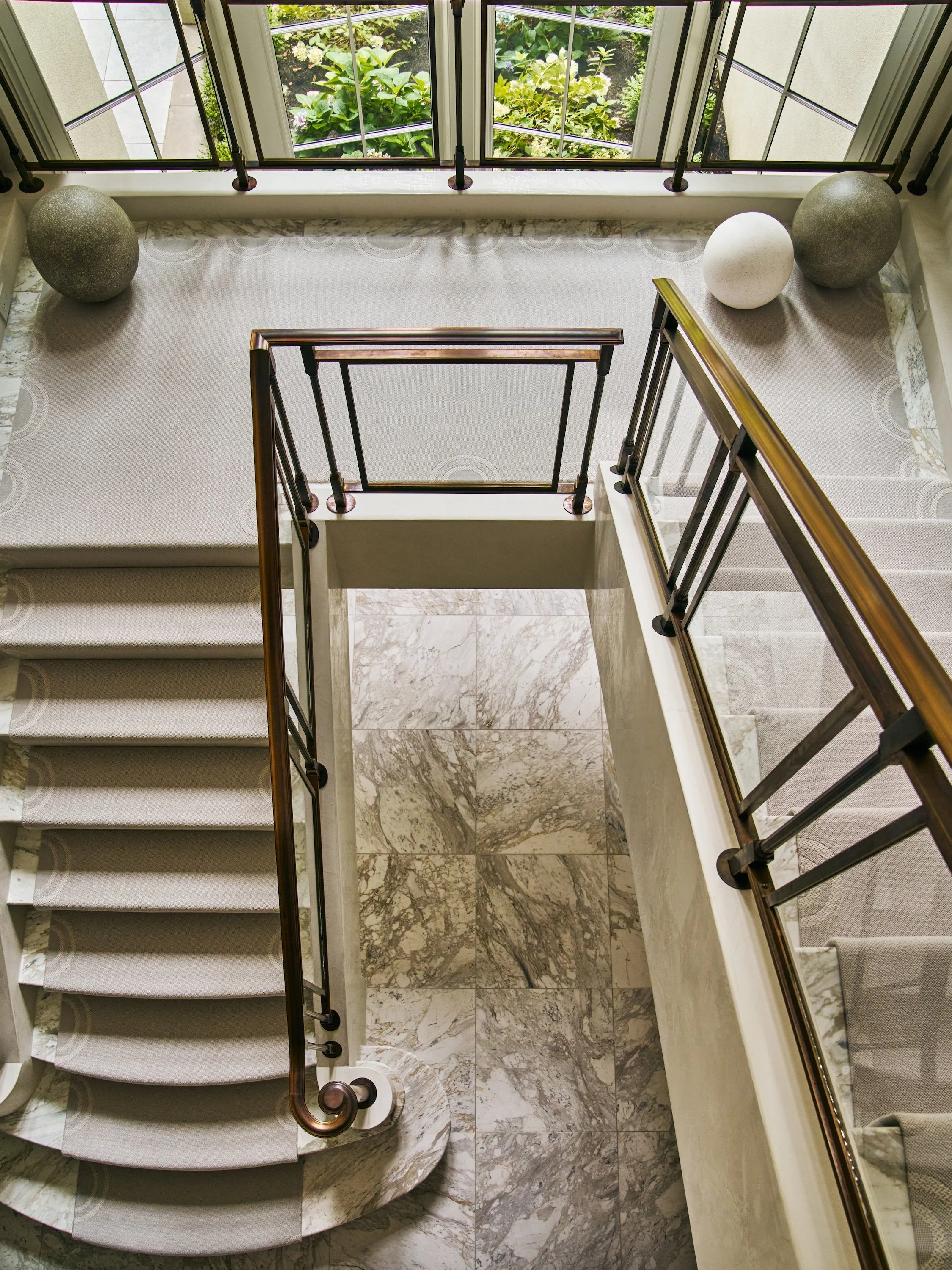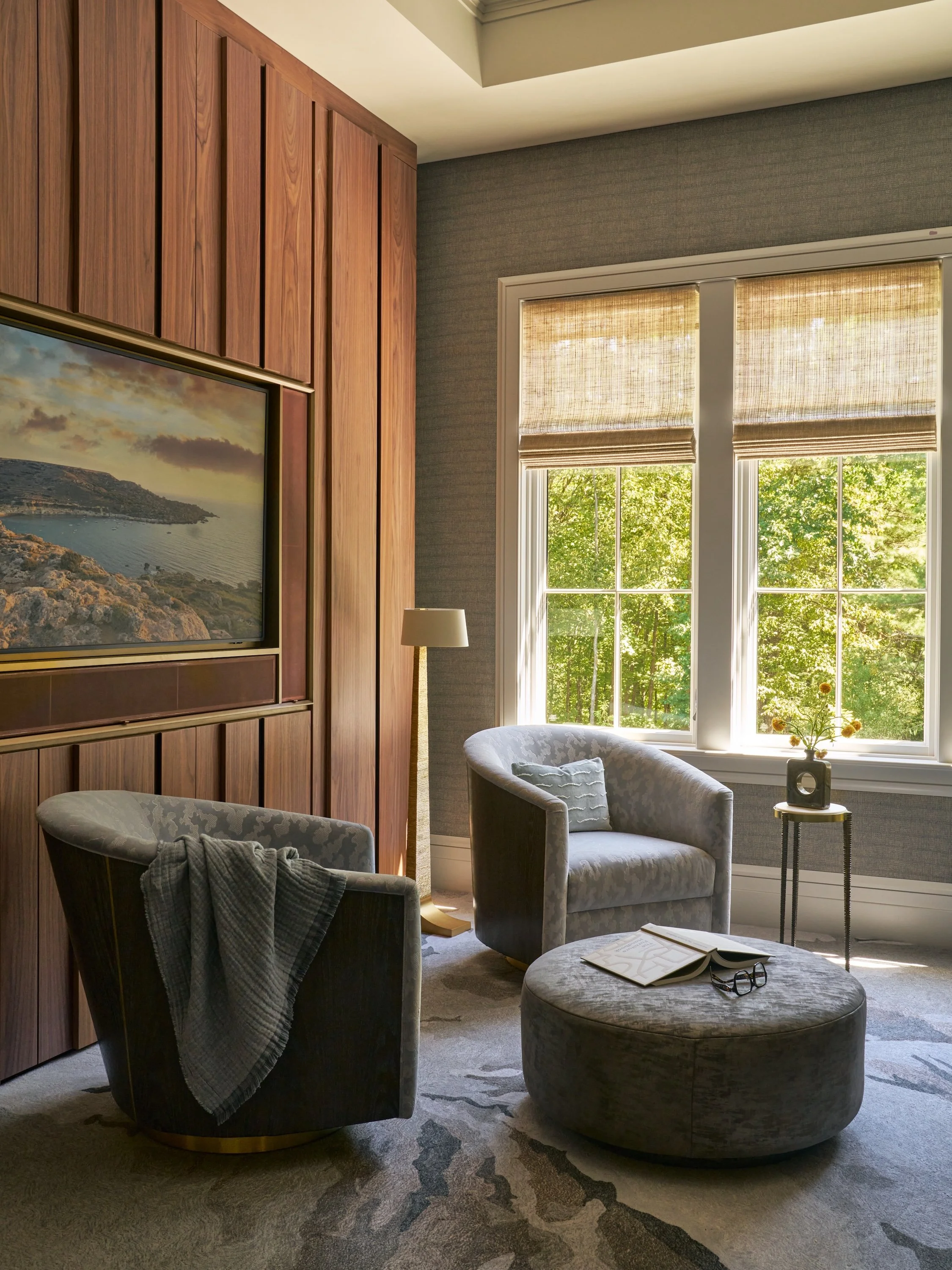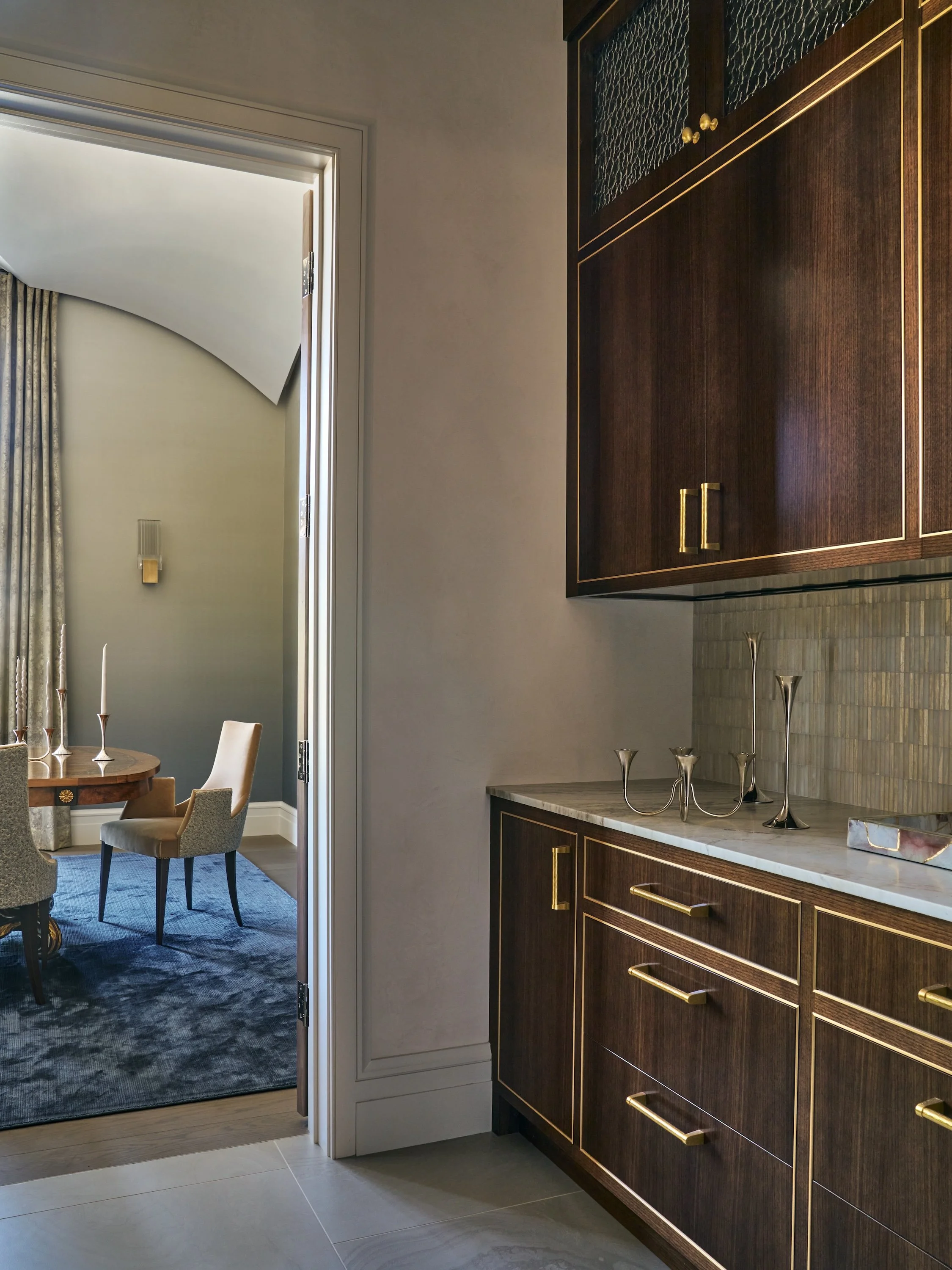 Bronze, marble, and fluted stone mark the architectural language—from the sculptural staircase to the fireplace and custom stone slab work—while layered woods and an entertainer’s lower level balance elegance with warmth and ease.