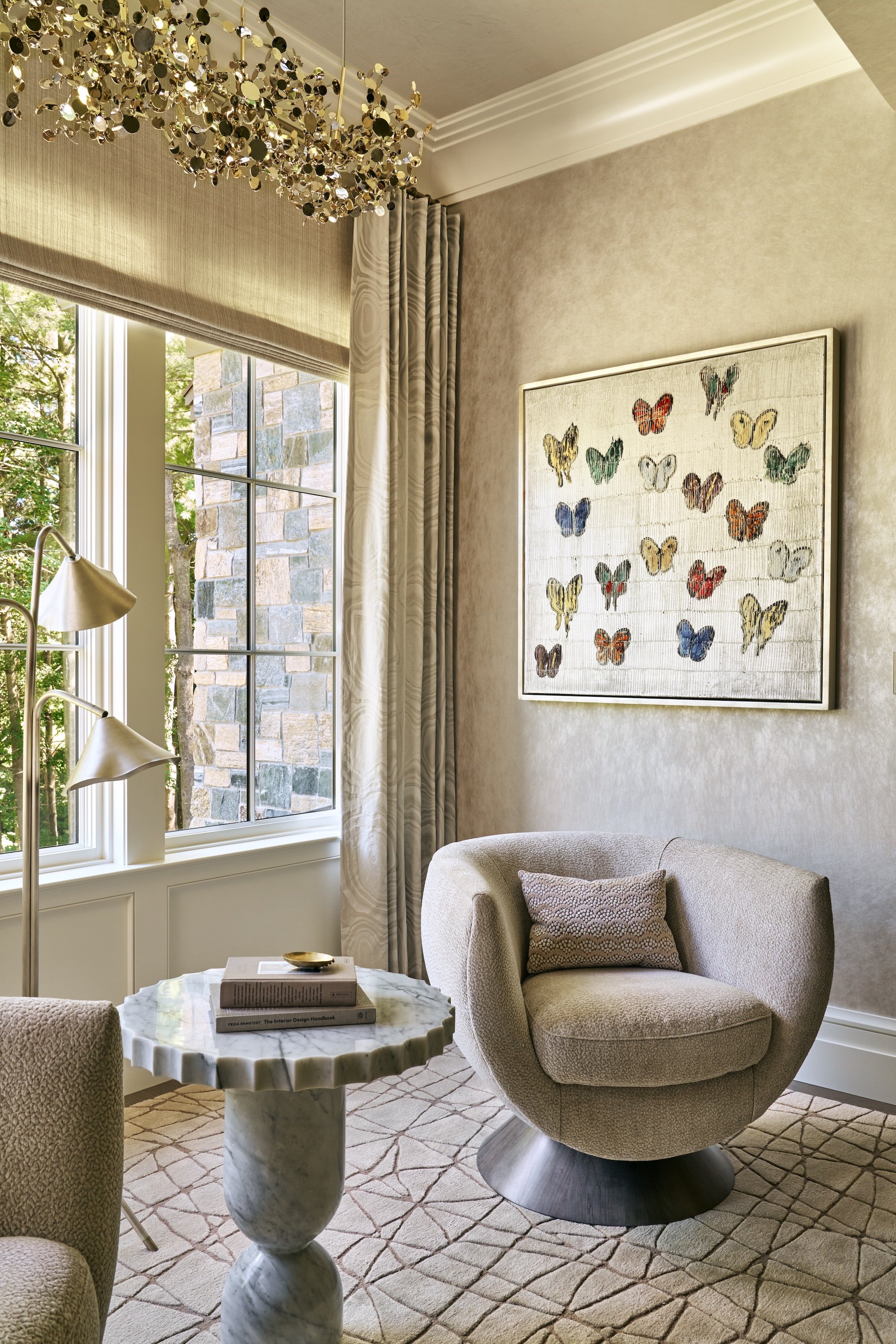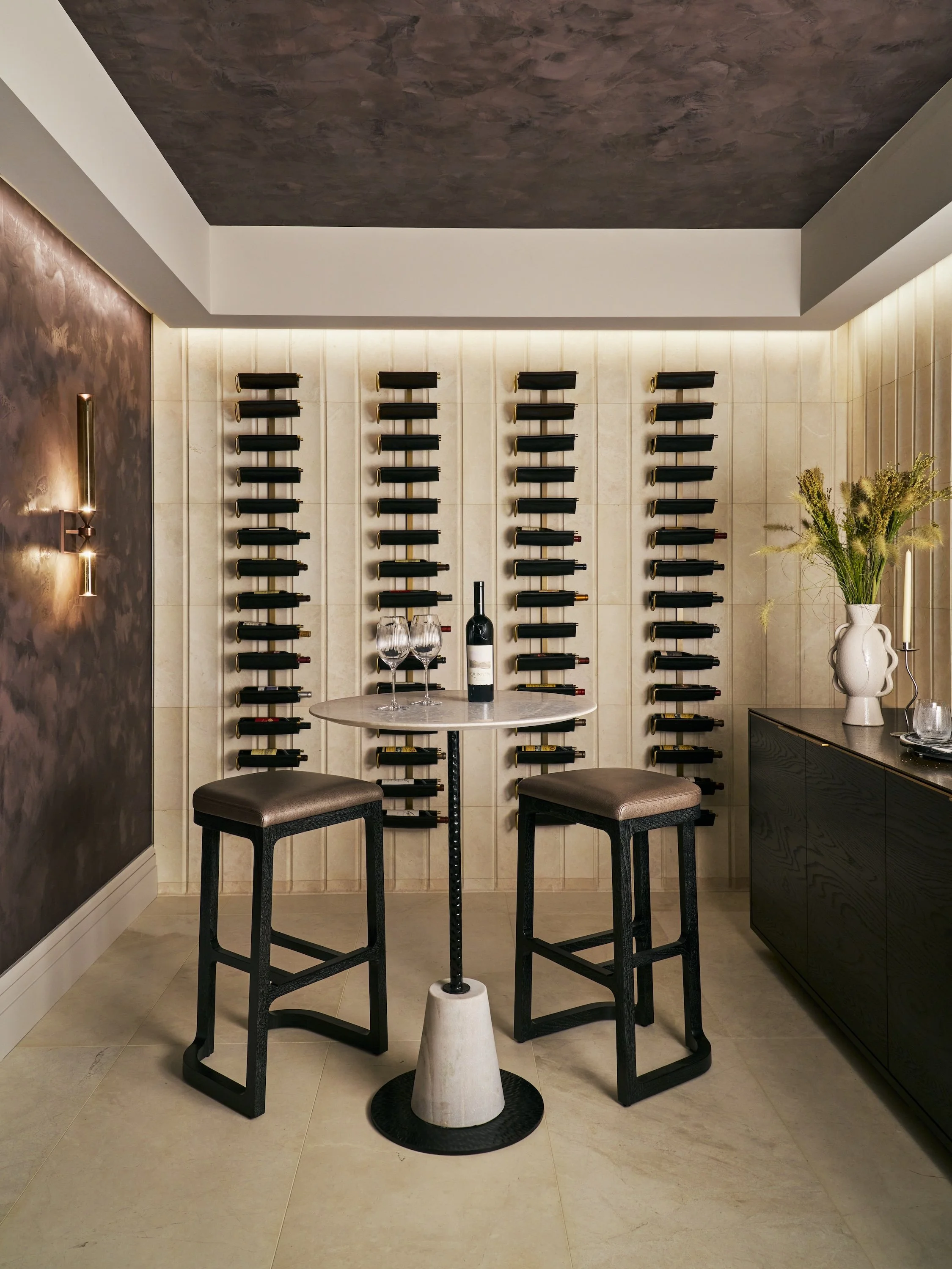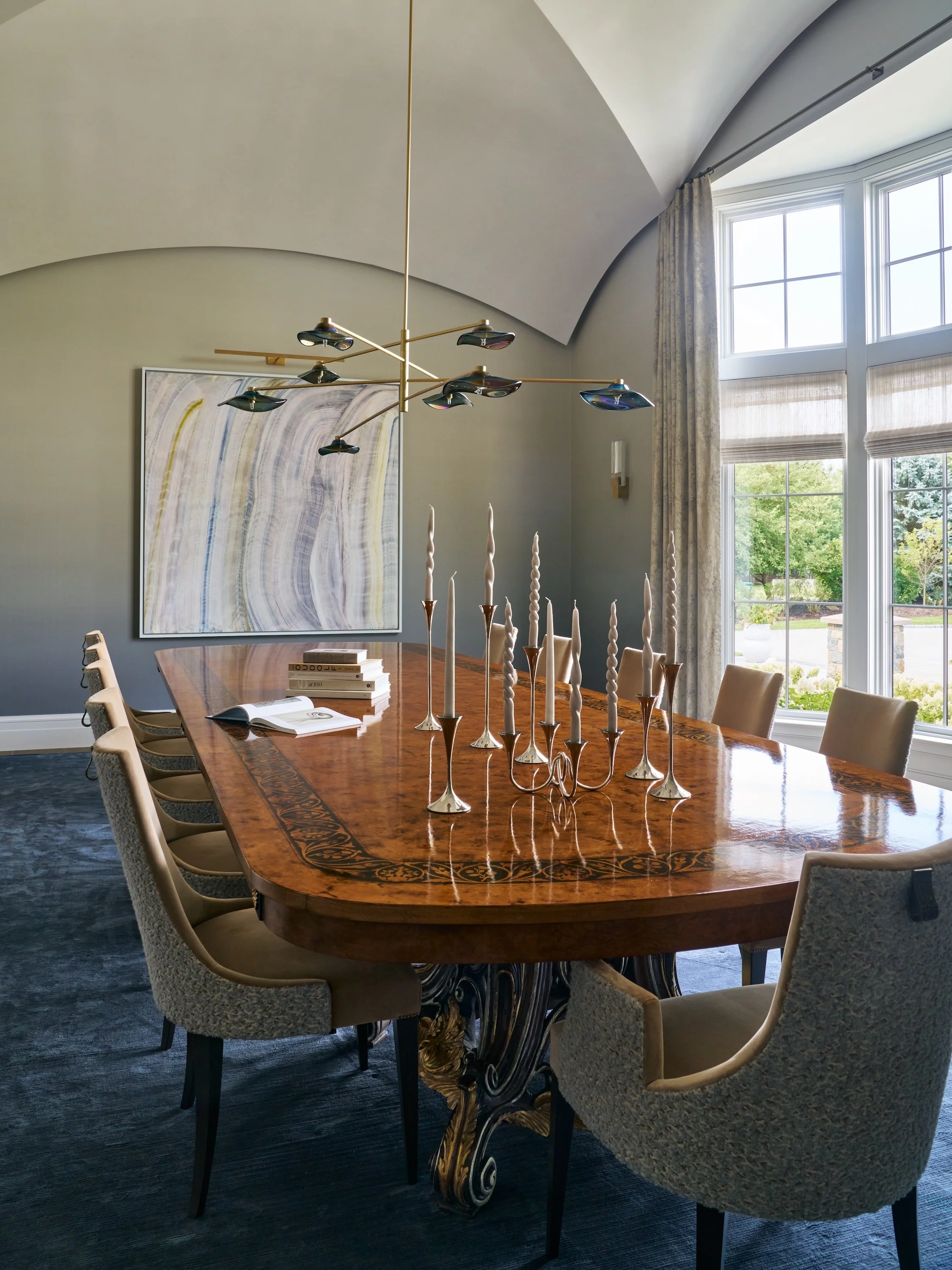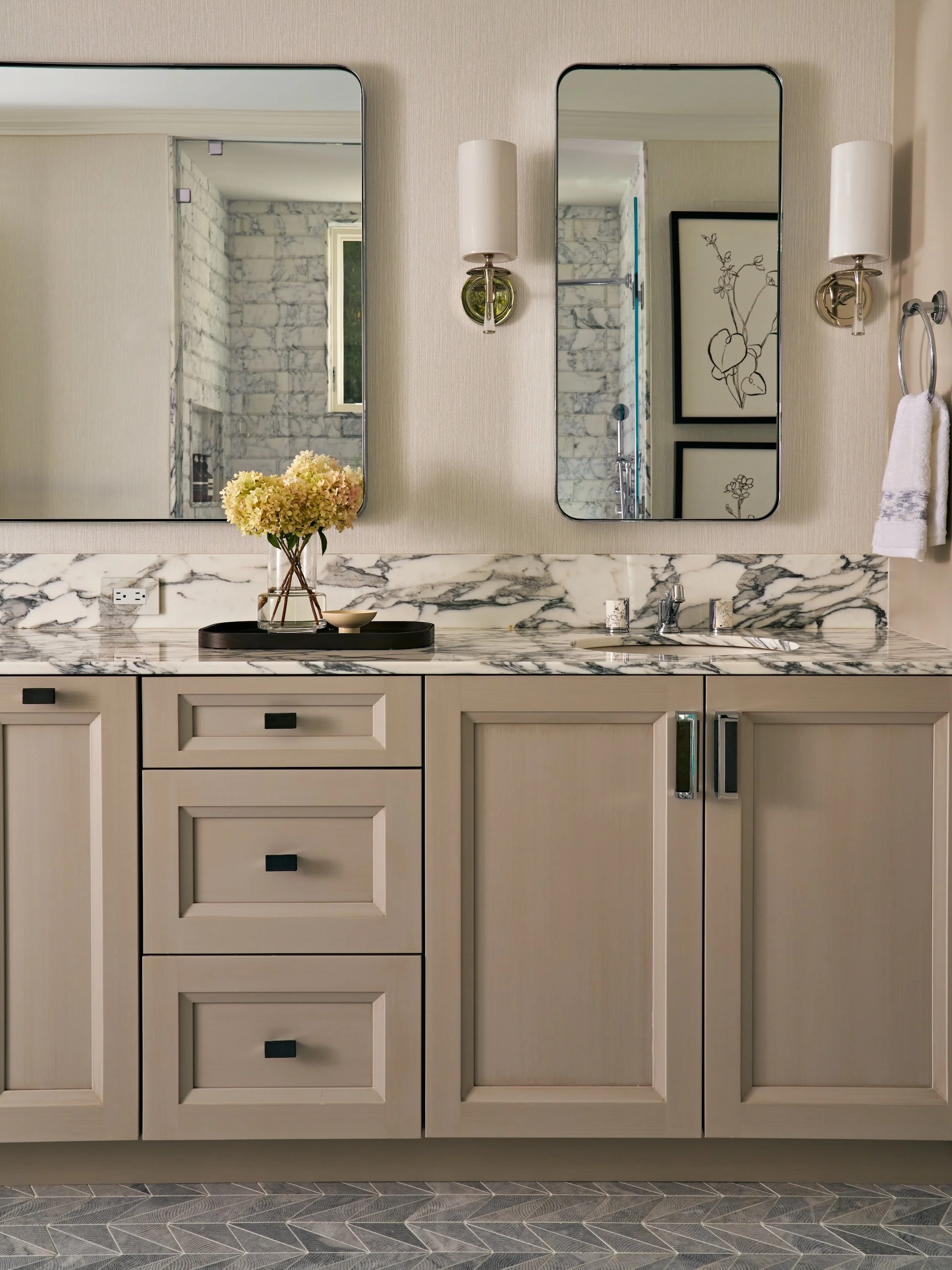 Bronze, marble, and fluted stone mark the architectural language—from the sculptural staircase to the fireplace and custom stone slab work—while layered woods and an entertainer’s lower level balance elegance with warmth and ease.