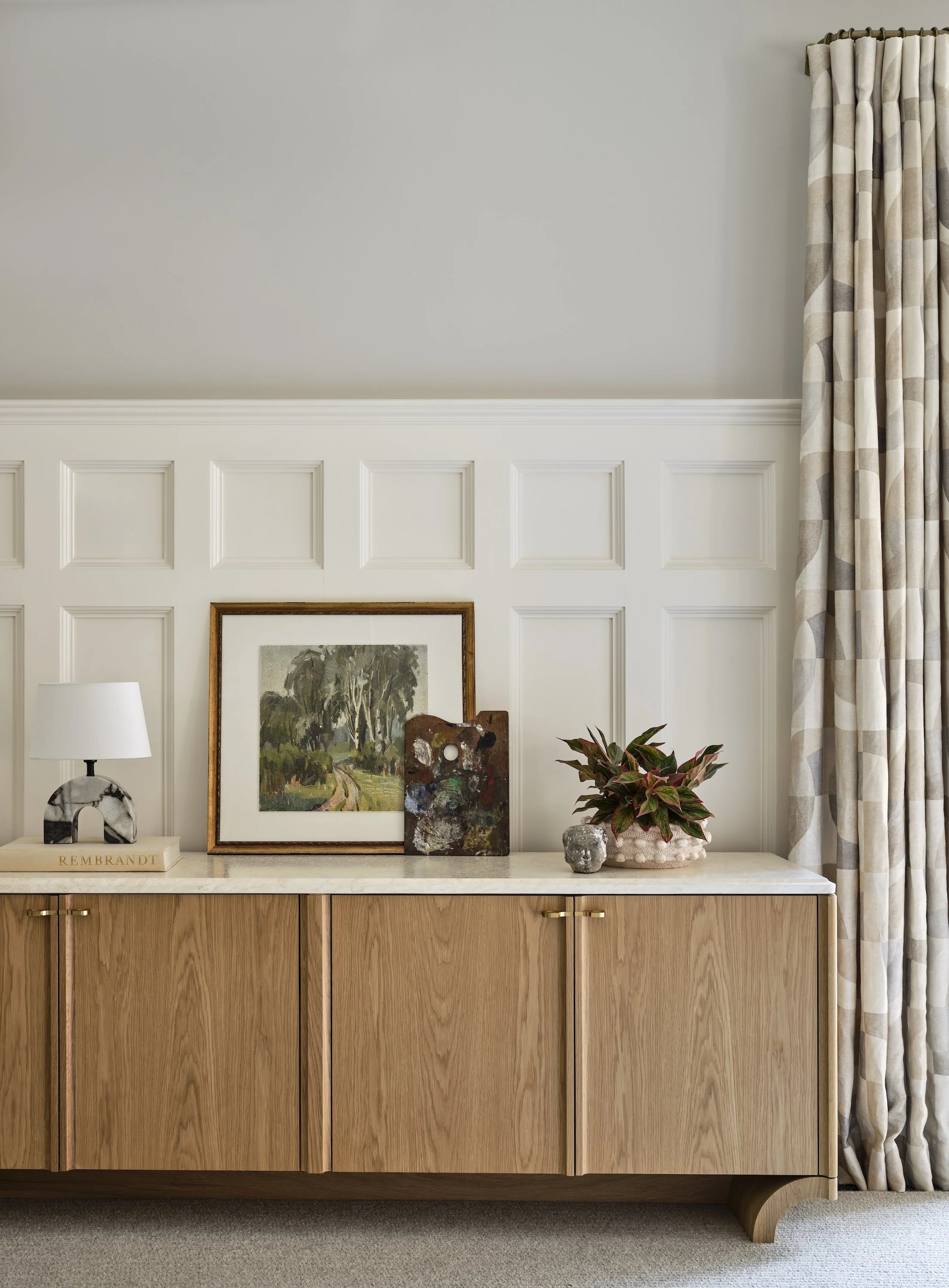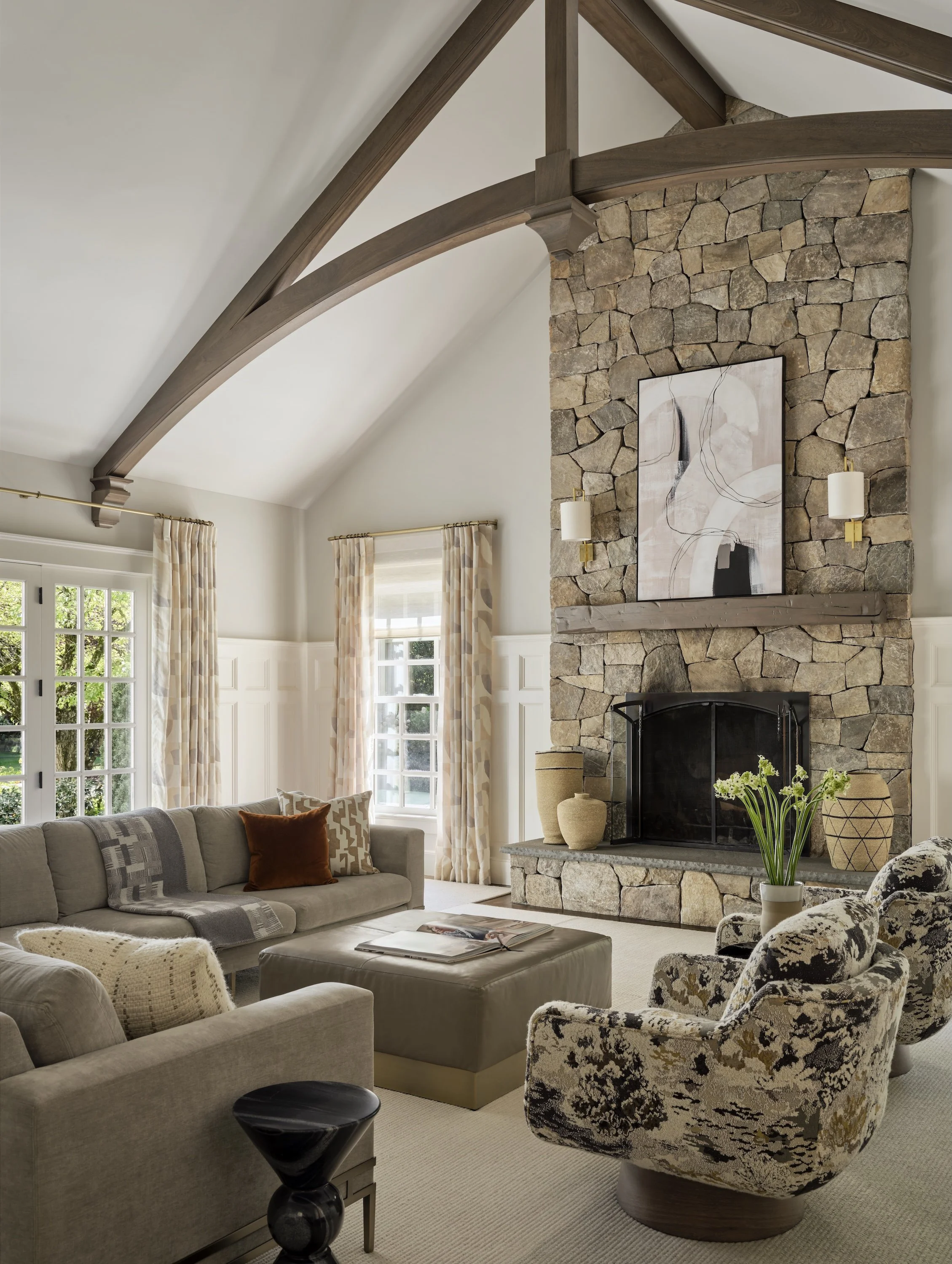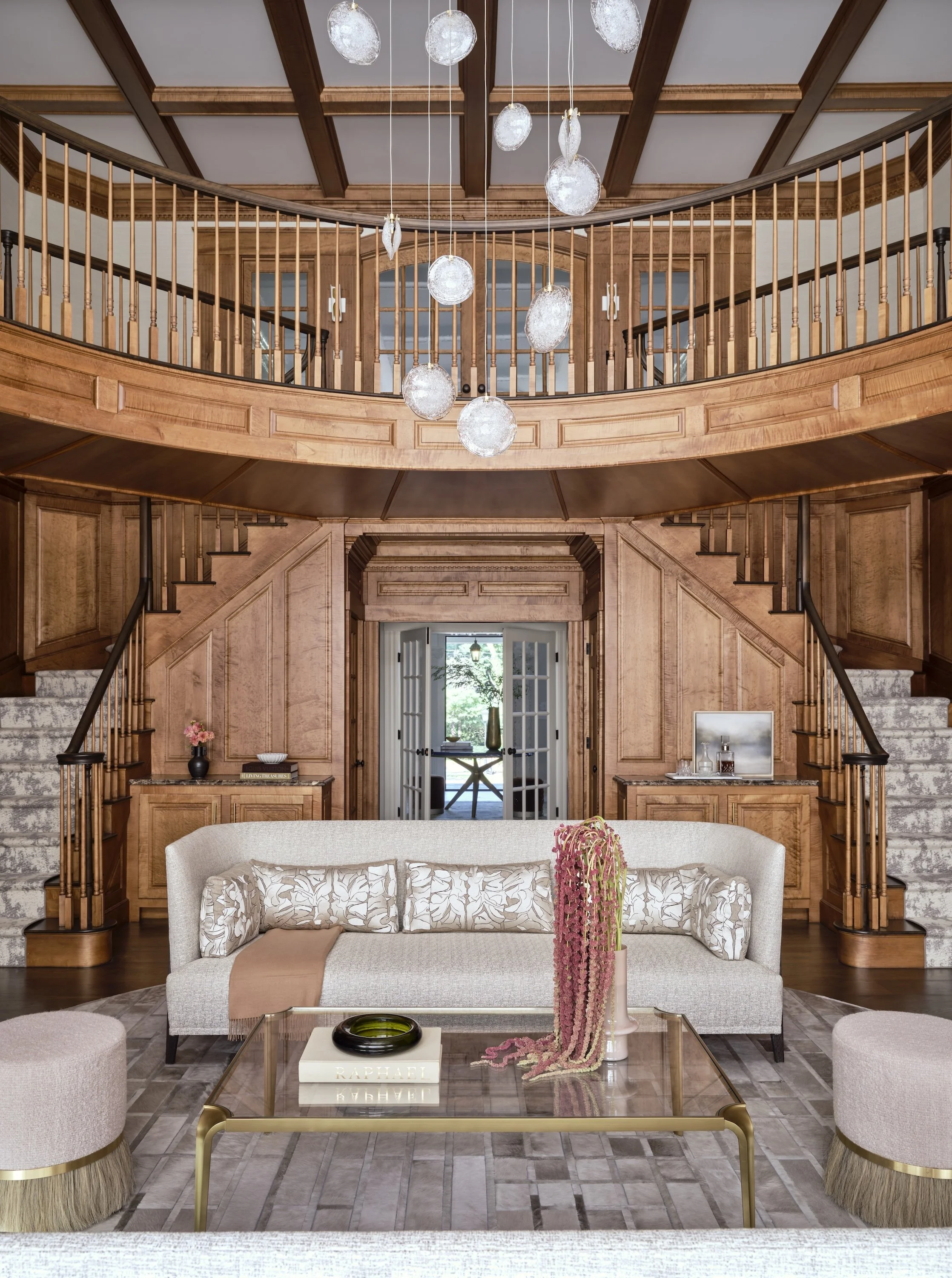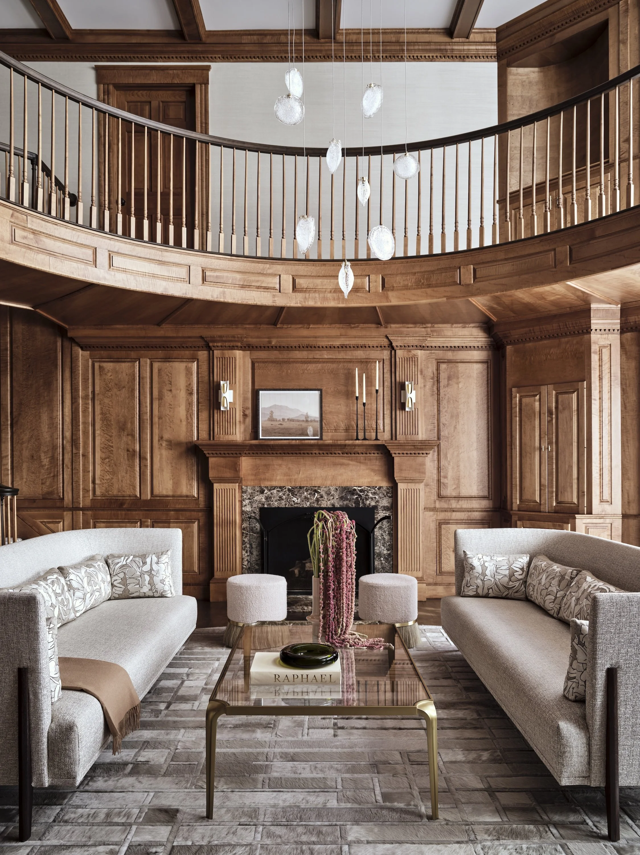 The fully wood-paneled living room pairs structured seating with soft, inviting surfaces. A pearl hide rug and ethereal glass chandelier add warmth and elegance, transforming the space for both entertaining and quiet family moments.